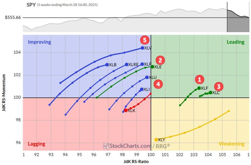 XLF has rotated back into leadership after a brief sojourn, while Communication Services (XLC) maintains its strong position. Energy (XLE) is the latest entrant, crossing over into leading with a positive RRG heading—a trajectory that bodes well for continued outperformance.