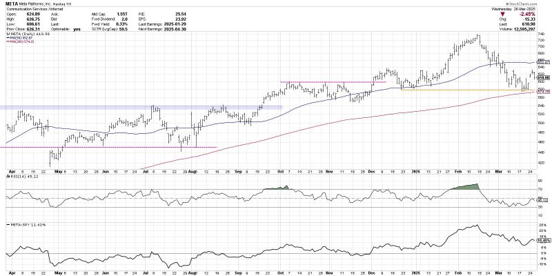 With the recent bounce, META has now established clear support at the 200-day as well as the December 2024 swing low. This “confluence of support” suggests that a break below $575 would confirm a new downtrend phase for this leading internet stock. Only if we saw a break back above the 50-day moving average around $650 would we consider an alternative bullish scenario here.